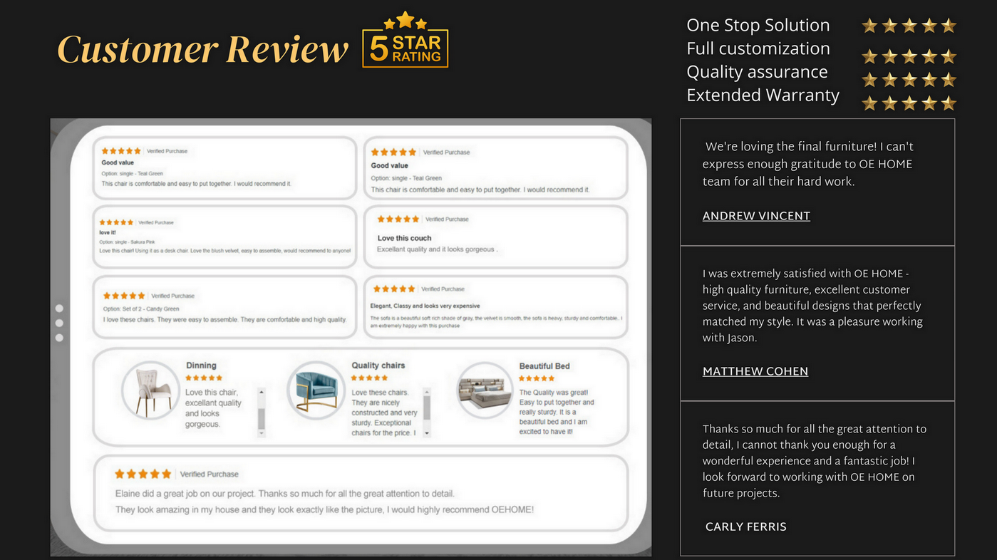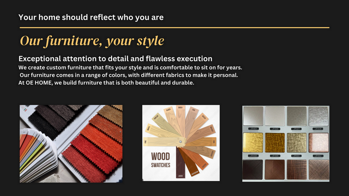 OE HOME FUINITURE - A LEADING FURNITURE MANUFACTURER IN CHINA. WHY CHOOSE US? - **Tailored to fit your needs** - Our furniture is created based on your specifications, so you won't need to scour every store to find a piece that fits your space. We can even make furniture to your exact height requirements, which is especially helpful for those who are extremely tall or exceptionally short. - **Designed for your utmost comfort** - You have the freedom to choose from a variety of options, including weaving, cushioned upholstery, solid or slatted backrests, contoured seats, and more to ensure your ultimate comfort. - **Personalized to your taste** - Why settle for second best when you can have furniture that looks exactly the way you want it to? - We offer complete customization options to ensure your furniture is just the way you like it. OE HOME custom furniture is here to help you bring out your vision of home to your kitchens, dining rooms, living rooms, and bed rooms.